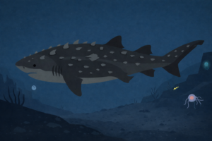 - オオワニザメ:六対の鰓裂をもつ上位捕食者。夜間に浅所へ回遊。