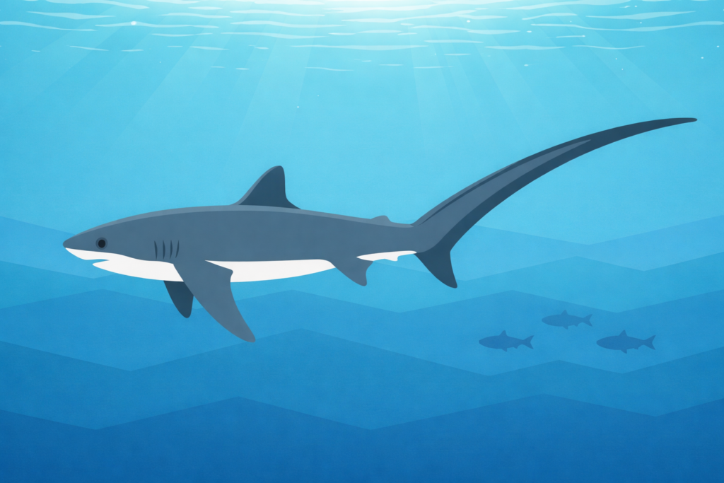 マオナガは、その名の通り「真の尾長」として、オナガザメ科を代表する堂々たるサメです。 ニタリと混同されがちですが、お腹の模様を見れば見分けることができます。 冷たい海でも活発に泳ぎ回り、長い尾を振るって狩りをするその姿は、まさに外洋のアスリートと言えるでしょう。